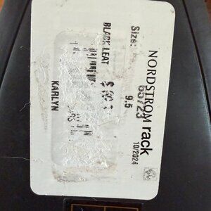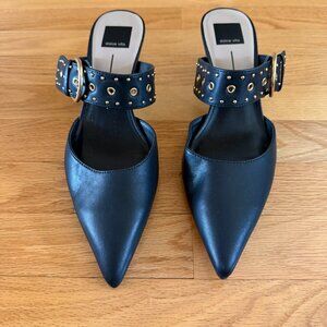 Dolce Vita Black Karlyn Mules. Brass toned buckle with grommets and studs secures the wide vamp strap. Pointed toe. I think part of the shoe is leather based on the sticker on the bottom of the shoe, however it feels like man made material. Like new condition with stickers on the bottom of the shoes. Clean with little to no signs of wear. Stickers are partially removed and torn. 2.5" heel. Size 9.5
