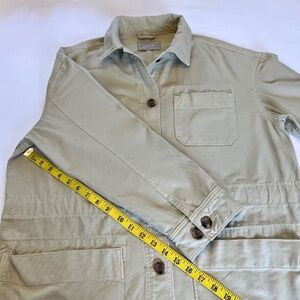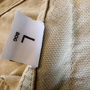 * Features: 3 exterior patch pockets, 1 internal pocket, interior drawstring cinchable waistband, button front and sleeve cuffs, heavy canvas fabric with a relaxed fit.