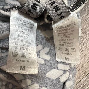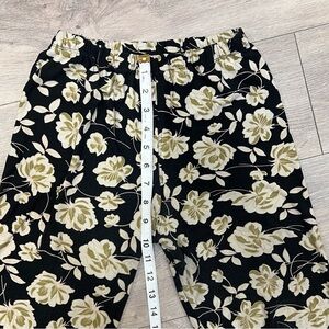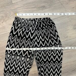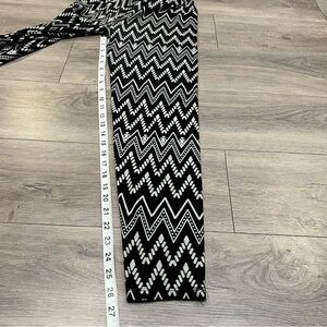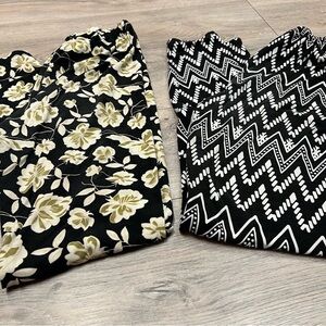 Women’s pants/leggings brand “ALWAYS” . 2 pairs pull on with elastic waist . One black with white geometric zig zag pattern, other is black with beige flowers. Both are size Medium. Buttery soft and comfortable !! . Butt and between legs the color has slightly faded. Check measurements and style before purchasing