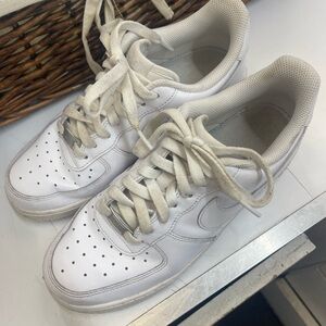 Stylish white Nike sneakers. Low-top design with classic swoosh. Ideal for everyday wear.