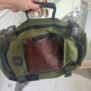 Sovrin Republic Meandrifter Kino Wander Convertible Duffle/Backpack in an olive or green color, featuring a brown leather patch. This bag is part of the brand's travel series, designed to be versatile as a carry-on backpack that can also be carried like a duffle.