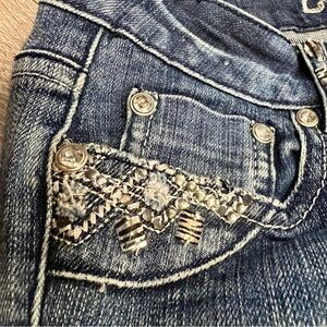 Y2K LA STAR Miss Chic Blue Denim Jeans. Skinny low rise jeans distressed, two regular standard pockets and one small coin pockets. Front of pockets have rhinestones, as well as the belt loops. Button zipper closure front button is a larger clear gem. Back pockets also with rhinestones. Women's size 7. Check pictures and style before purchasing.