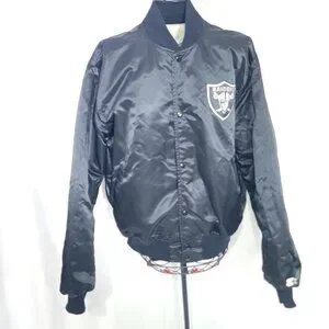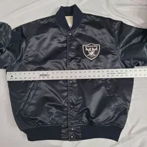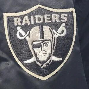 This vintage Raiders bomber jacket features iconic NFL and team logos, a quilted interior for added warmth, and a classic satin finish for style.