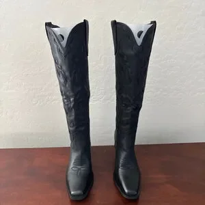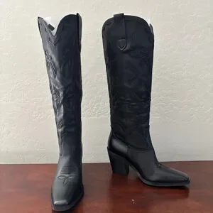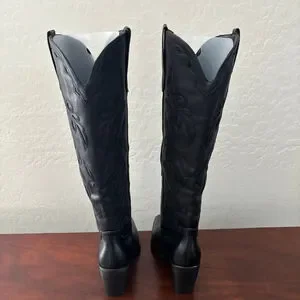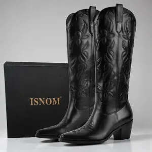 ISNOM western-inspired knee-high boots in black with classic tonal embroidery. Designed with a sturdy block heel and pull-on silhouette, these boots offer a timeless cowgirl aesthetic that pairs well with denim, dresses, and festival or everyday wear. New with box.