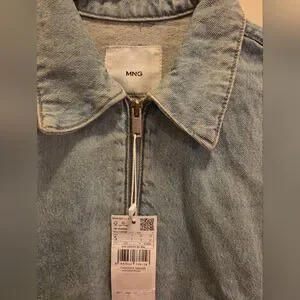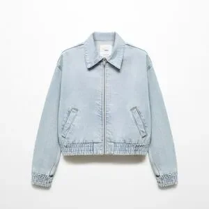 Cotton denim fabric. Bomber design. Shirt collar. Long sleeves with elastic cuffs. Two side pockets. Elastic waistband. Zip fastening on the front section.