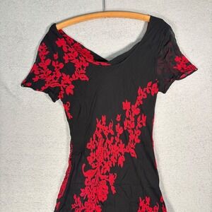 Eva Blue Cowl Neck Tiered Dress Sz 14 Black Red Floral Print Stretch Whimsigoth