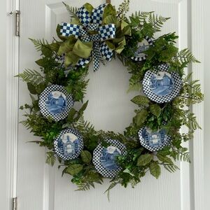 Our Royal Toile Fern Wreath is pure blue bliss. It features miniature ceramic plates decorated with images from our farm done in classic blue chinoiserie style, including our studio, gazebo, and the Mrs. Powers Garden Gate, which leads to our one-of-a-kind Chicken Palace. Royal Check ribbon provides the finishing touch.
