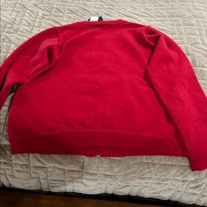 Charming Disney sweater with floral and character motifs. Features vibrant red and pink colors. Elegant gold button details.