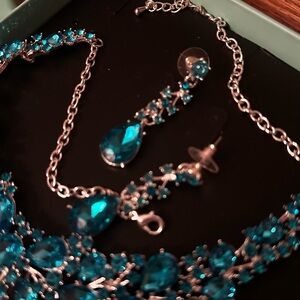 This stunning jewelry set features a vibrant blue crystal necklace and matching earrings, perfect for adding a touch of elegance to any outfit. The intricate design and shimmering crystals make it a standout piece for any occasion. Never worn before just taken out of box but in perfect condition.
