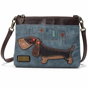 Adorable Chala crossbody bag featuring a dachshund dog design with stitched and textured details. Compact size perfect for everyday essentials. Vegan leather exterior with adjustable crossbody strap and zip-top closure. • Brand: Chala Handbags