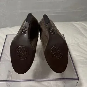 Elegant brown suede wedge ankle boots by Tory Burch. Ideal for versatile styling.