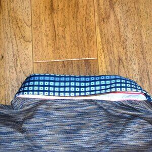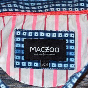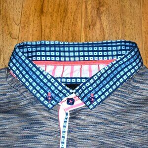 Short sleeve polo shirt by Maceoo. Size 6/2XL (not a traditional 2XL size as it measures smaller...please refer to measurements below. It measures more like a large) and 100% cotton. Color: Vivid Grey. Features a heathered type look in gray/blue/white. Collar features blue check pattern, with a pink stripe pattern inside neck area. In excellent used condition with no holes, tears, or stains. Comes from a smoke free home.