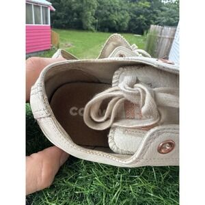 The inside needs a good cleaning The product is a pair of Converse All Star Ox Lo Ladies Leather Trainers in ivory white, US size 8. These lace-up sneakers feature a low-top shoe shaft style with a rubber outsole, making them ideal for casual activewear in the summer, fall, and spring seasons. Crafted from leather with a fabric lining and foam insole, these trainers are part of the Converse All Star product line and have a classic white color with a star theme, perfect for women looking for stylish and versatile footwear.