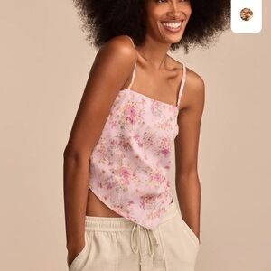 This charming camisole from Lucky Brand features an asymmetrical design with a delicate pink and white floral print. The fitted bodice and straight neckline create a flattering silhouette, while the thin straps add a touch of elegance. Perfect for adding a romantic flair to any outfit.