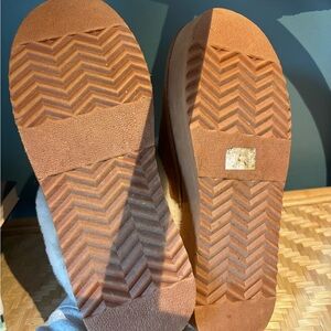 Comfortable tan slippers featuring a soft white fur lining. Perfect for lounging.