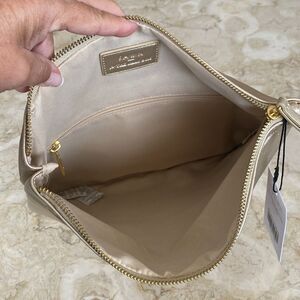 Brand new vegan leather clutch in lovely metallic gold. Fold over design with magnet closure, zippered top, cloth lined interior with zip pocket. Comes with dust bag. Great clutch for an evening out, it has lots of room to carry wallet, phone, keys, make up and more.