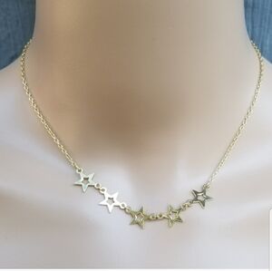 Beautiful dainty necklace is gold plated brass with 5 star charm design. Necklace measures 15 inches in length with a spring clasp closure.
