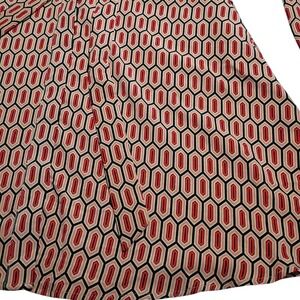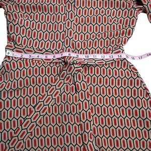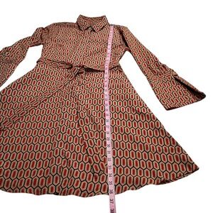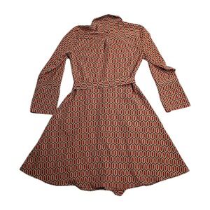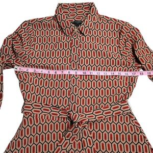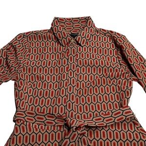 The Banana Republic Shirt Dress in red, size 6, features a belted waist and split bell sleeves, making it a stylish choice for various occasions such as parties, workwear, or business events. The dress has a collared neckline, long sleeves with a button closure, and a geometric pattern. Made from polyester, this midi-length dress in the preppy style also includes pockets for added convenience. Easy to care for with machine washable instructions, this dress is a versatile and chic addition to any woman's wardrobe.