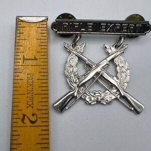 Authentic vintage U.S. Military Rifle Expert Qualification Badge with original clutch backs. This badge was awarded to service members who achieved expert-level marksmanship with the rifle.