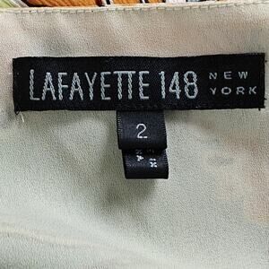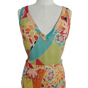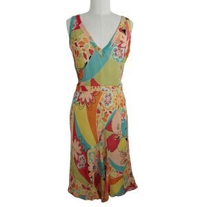 Lafayette 148 New York 100% silk dress in women's size 2. Colorful mod floral print. Sleeveless. V-neckline. Lightweight and flowy. Side zipper. Dress is lined. Has a few small faint spots. Not too noticeable due to the print. See photos.