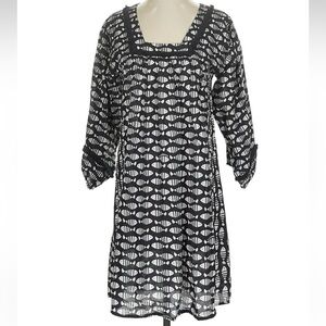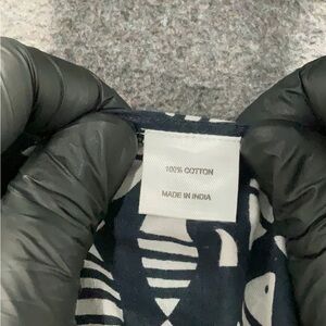 Navy and white garment with a distinctive pattern. Features a small size tag.