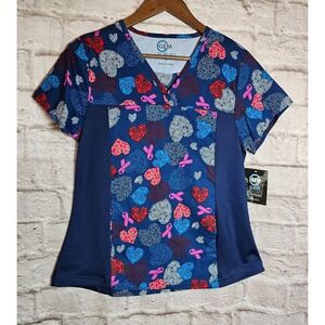 Quality made, durable and super cute! NWT Size S Women's Scrub Top. Hearts and Pink Ribbons pattern; Breast Cancer Awareness. Uplifting and inspiring. Flattering stretchy side panels for max comfort.