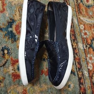 Stylish navy loafers by Cole Haan. Features a sleek design with a white sole.