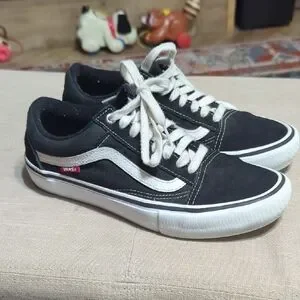 Vans Old Skool Pro skate shoes in a black and white colorway with suede and canvas uppers.