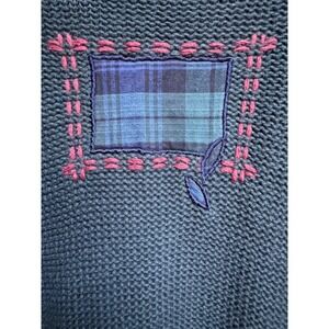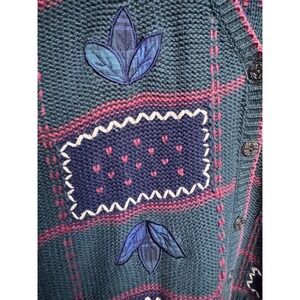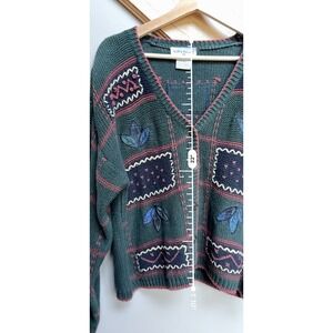 Keywords: Kathy Ireland, Women's cardigan, Large sweater, Green sweater, Plaid detail, Embroidered leaves, Button front, Ramie cotton blend, Vintage knitwear, Retro fashion, Cozy pullover, Casual top, Bohemian style, Feminine knit, Teacher, Fall, Patchwork