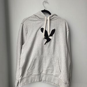 Cozy gray hoodie with bold black eagle logo. Features a front pocket and drawstring hood. Perfect for casual wear.