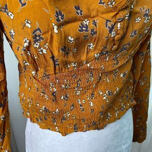 Elodie Gold Floral Cropped Smocked Long Sleeve Boho Top SZ L