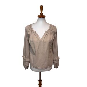 Elegant tan blouse with stylish details, perfect for any occasion. Really good condition with light wear. Perfect to dress up or down! 5.7 oz