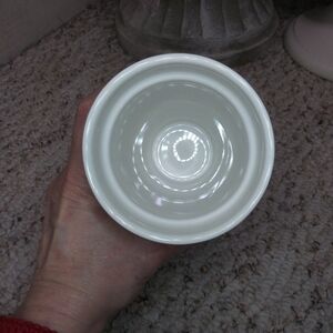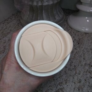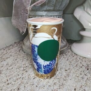 Like new, beautiful double walled insulated, limited edition collectible porcelain travel mug with metallic gold and blue Asian patterned scarab design with large green dot. This mug was from the 2014 Christmas holiday Dot Collection. Mug had pale pink removable plastic slide lid and holds 12 ounces of liquid. Please see all photos.