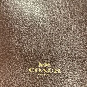 Leather Coach tote in dark brown leather with red interior. Perfect for daily use. NWOT. ONLY call out at the bottom of the bag. Carefully review pictures. 12.5 inches in length, 10.75 inches height & 5 inches in width.