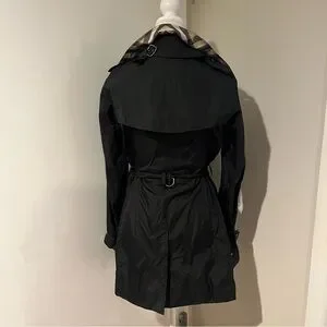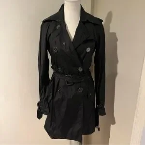 Timeless black trench coat with a sleek design. Features double-breasted buttons and a matching belt.