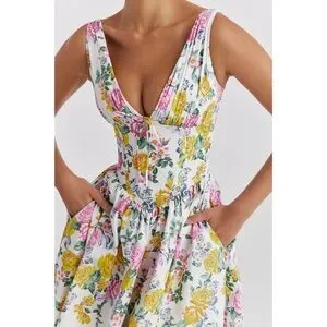 - Floral print, boned bodice, back zip closure with hook and eye closure, V back, lined, gathered bust with decorative tie, pockets