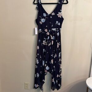 Premier Amour Chiffon Ruffle V Neck Sleeveless Asymmetrical Fully Lined Navy Floral Size 12