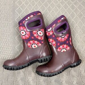 These Bogs North Hampton Kaleidoscope insulated waterproof rain boots are in overall great shape. The boots feature purple rubber on the lower half and a purple, pink, and white floral pattern on the neoprene upper half. Key features include: