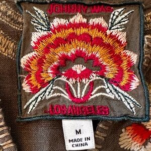 This exquisite blouse by Johnny Was showcases a rich gray hue adorned with intricate embroidered floral embellishments. The 3/4 sleeves and elegant design make it a versatile addition to any wardrobe, perfect for both casual and sophisticated