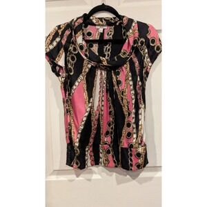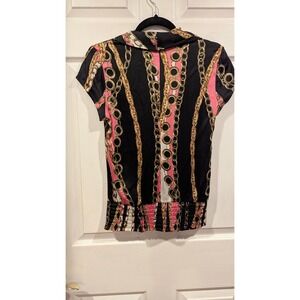 CacheY2 K Silk black pink gold chain print cowl neck short sleeve top Sz S