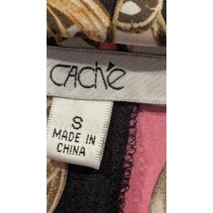 Captivate with this stunning Cache top, a luxurious blend of art and fashion. The striking black fabric is adorned with a bold gold chain print interwoven with vibrant pink and white accents, creating a visually arresting design. A sophisticated cowl neck drapes elegantly, adding a touch of refined glamour, while the short sleeves offer a chic and comfortable silhouette. This top is perfect for making a statement at a chic brunch or a sophisticated evening out.