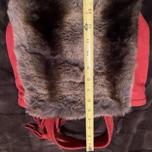 Chic red shoulder bag with brown faux fur trim. Features a stylish tassel accent. Perfect for any occasion.