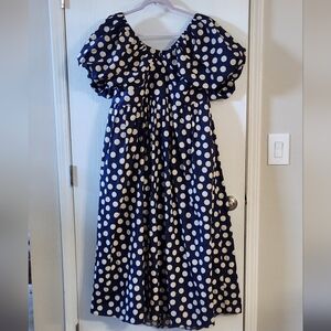 Elegant dress with puff sleeves. Features a deep V-neckline and playful polka dots. Ideal for versatile styling.