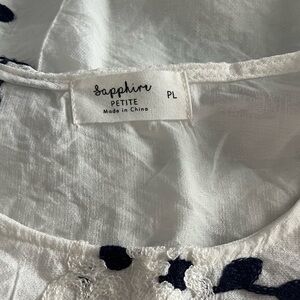 This elegant white blouse features intricate navy embroidery, perfect for adding a touch of sophistication to your wardrobe. Ideal for both casual and formal occasions.