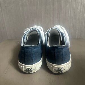 Denim blue sneakers with white laces, featuring the CK logo on the side.