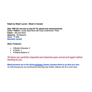 Ralph Lauren RRL 44R Blue Plaid Casual Wool Silk Designer Blazer Sport Coat