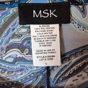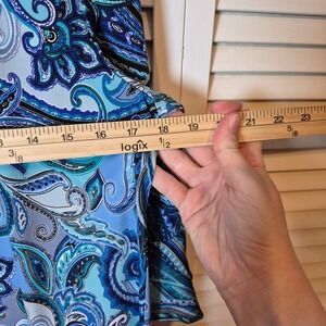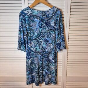 MSK Dress Women L Blue Paisley Midi 3/4 Bell Sleeve Stretch Knit Pullover USA