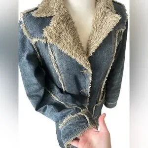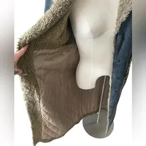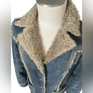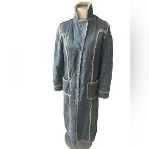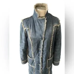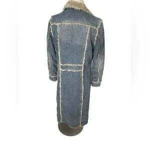 Elegant long denim coat with cozy shearling trim. Features button closure and front pockets. Ideal for stylish warmth. In great condition no flaws.