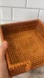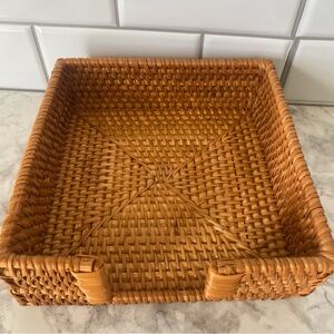 Vintage woven rattan napkin holder with an open rectangular design and warm honey tone. A charming tabletop piece for cottage kitchens, casual entertaining, or everyday use.