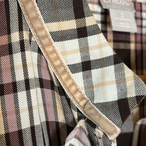 Out of stock, Chico's size 2 equivalent to a size Large brown fall tone plaid flannel ruffle front button down top. Super soft and cozy. Beautiful top. Elegant, flattering, feminine, cottagecore look. Excellent pre worn condition. (B)
